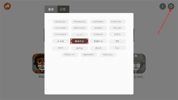 2、点击右上角的齿轮,可以切换语言,把游戏设置成简体中文
