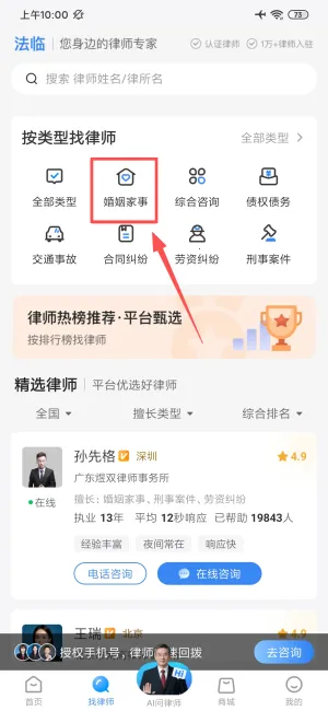 1、于找律师页面选择婚姻家事分类,进入对应的律师列表界面。