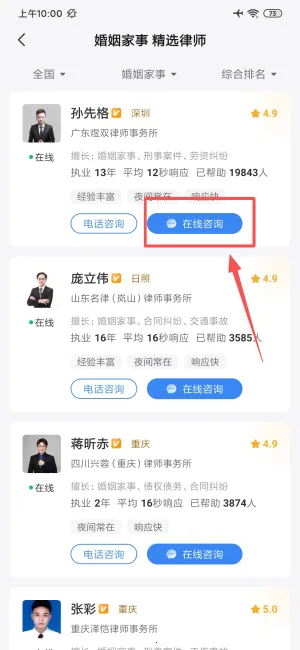 2、在列表中选定目标律师,点击其在线咨询进入沟通页面。