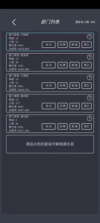 说说我的玩法,初期别开套房、高级大床、行政套房、总统套房,我三星了这些也住不满,然后走量的单人、标间、情侣、大床、街景等切记别升级太高,升级高了房价提升影响入住率,钱多了就慢慢扩张那些走量的房型。