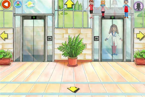 场景内几乎所有物体均可点击互动:例如点击电梯按钮等待开门,拖拽角色进入轿厢,稍作停留即可自动抵达二楼,过程自然流畅。