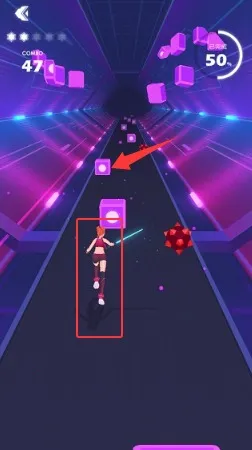 4、通过滑动屏幕控制光剑挥动方向,准确击碎迎面飞来的彩色方块获取连击分数。