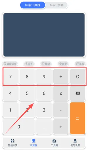 1、打开软件先熟悉界面布局,数字区与运算符分区明确,基本计算直接点击按钮即可得到结果。