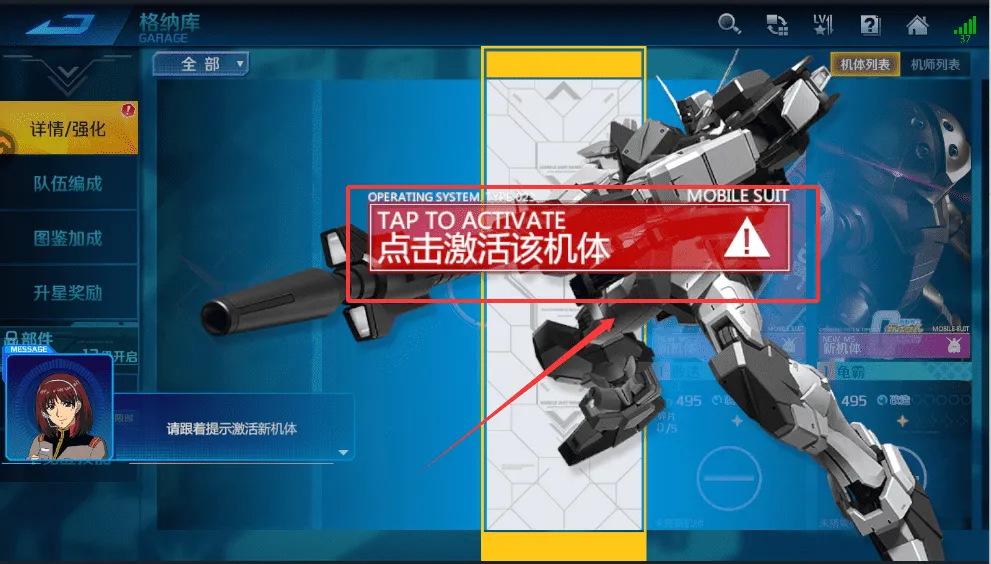 1、要激活新机体呢,可以先进入格纳库界面,找到提示“点击激活该机体”的酷炫机体,按照提示操作就行啦。