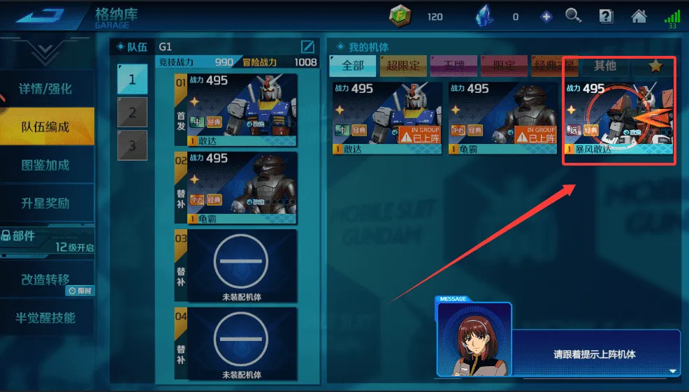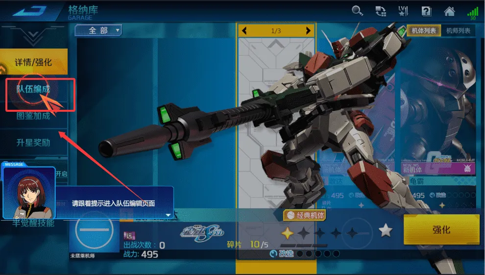 3、想要编队出战,可以在格纳库进入队伍编成,从我的机体列表里选择机体,根据指引上阵就可以。