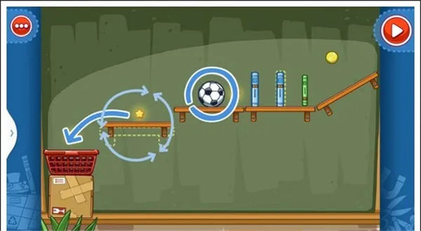 我们只需要将两个木板凳放在斜放在两侧,气球放在足球下面,这样使气球飞上去,碰到足球这样就能获得星星。