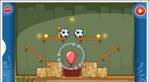 我们只需要将两个板凳放入图中所示位置,和一个气球放在那个书本底下,就可以让球滚下,获得星星。